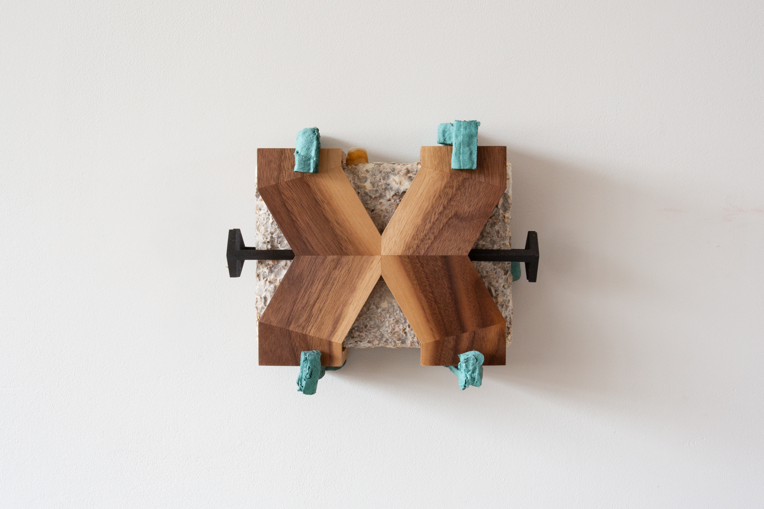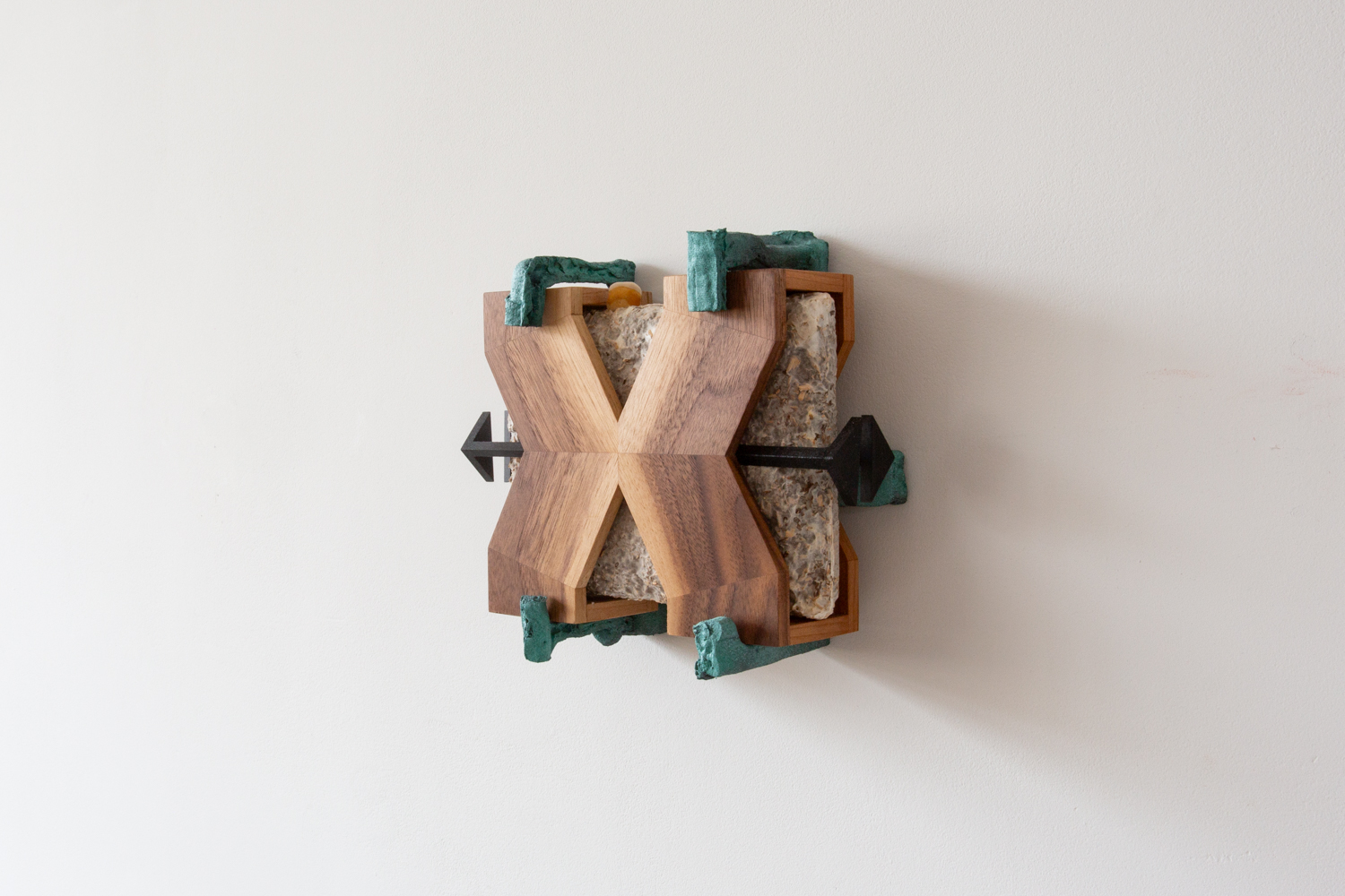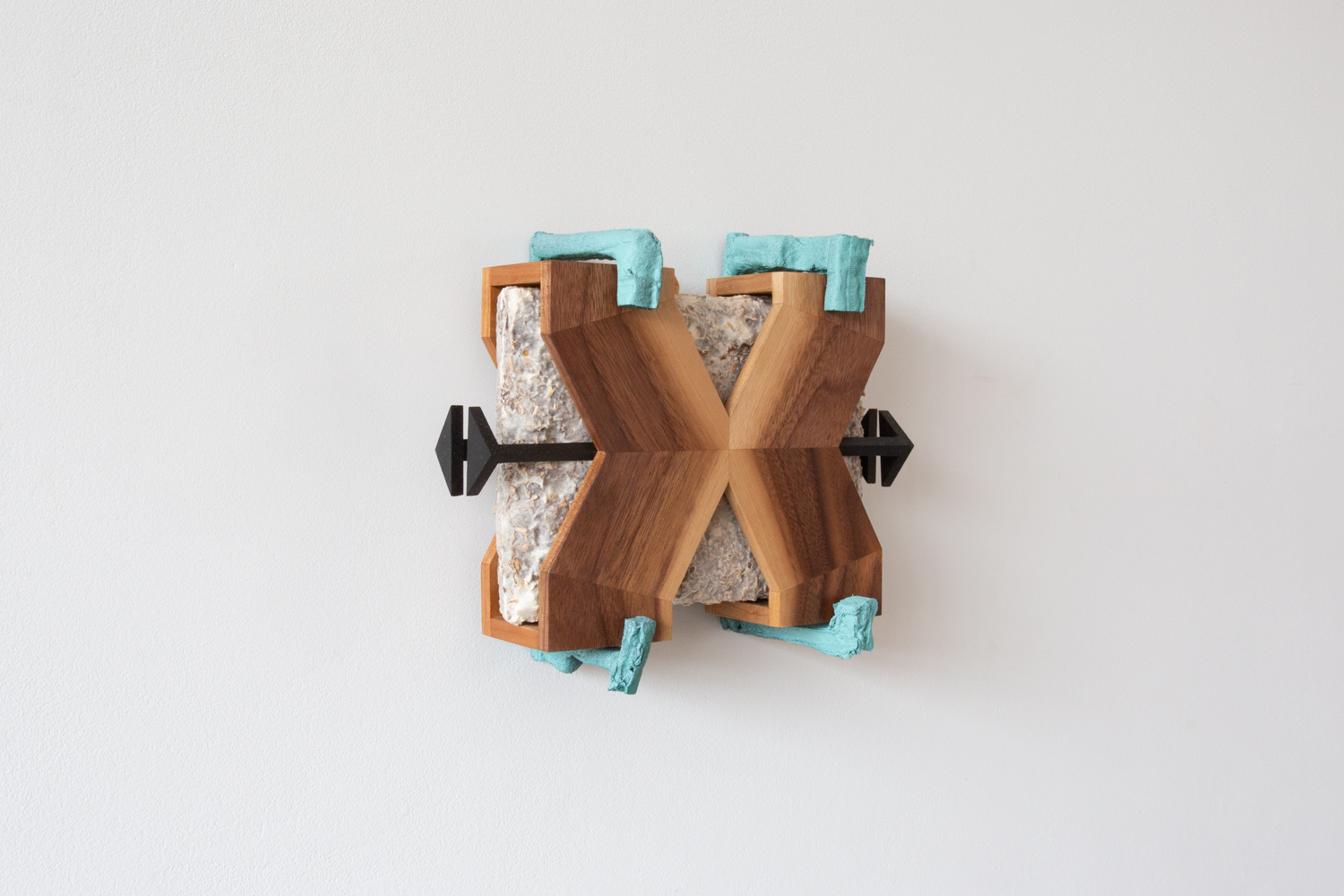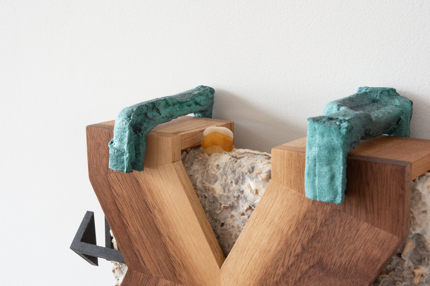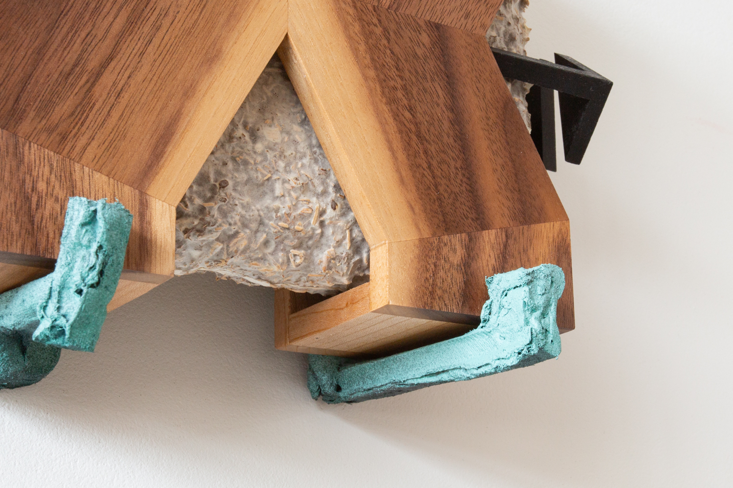 A Day Called X, 2024 Mycelium, walnut, valchromat, paper pulp, MDF, acrylic, spray paint.18cm x 21cm x 8.5cm